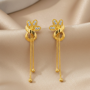 Chic gold-tone floral earrings with shimmering CZ petals and sleek chain drops. A modern statement piece that blends elegance, movement, and everyday glamour.