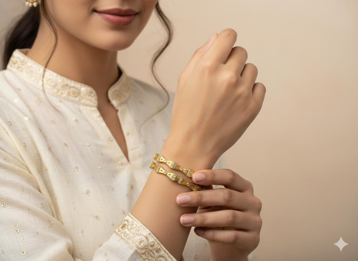 A timeless pair of classic bangles featuring elegant stone-studded segments. Skin-friendly, lightweight, and perfect for daily wear, festive occasions, and gifting.