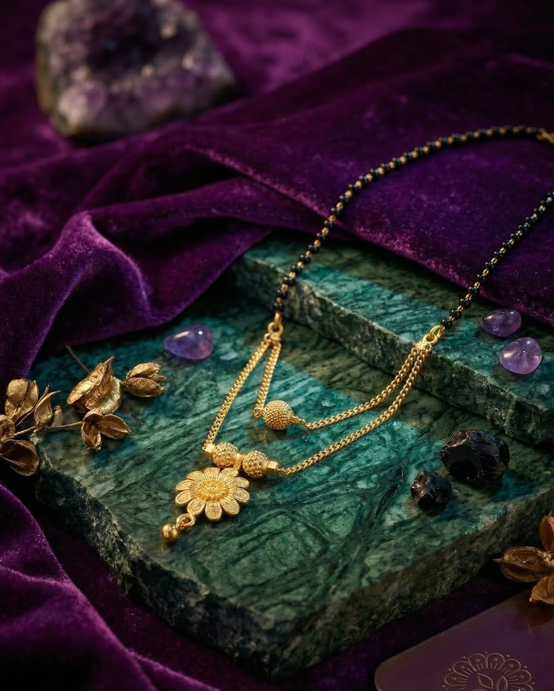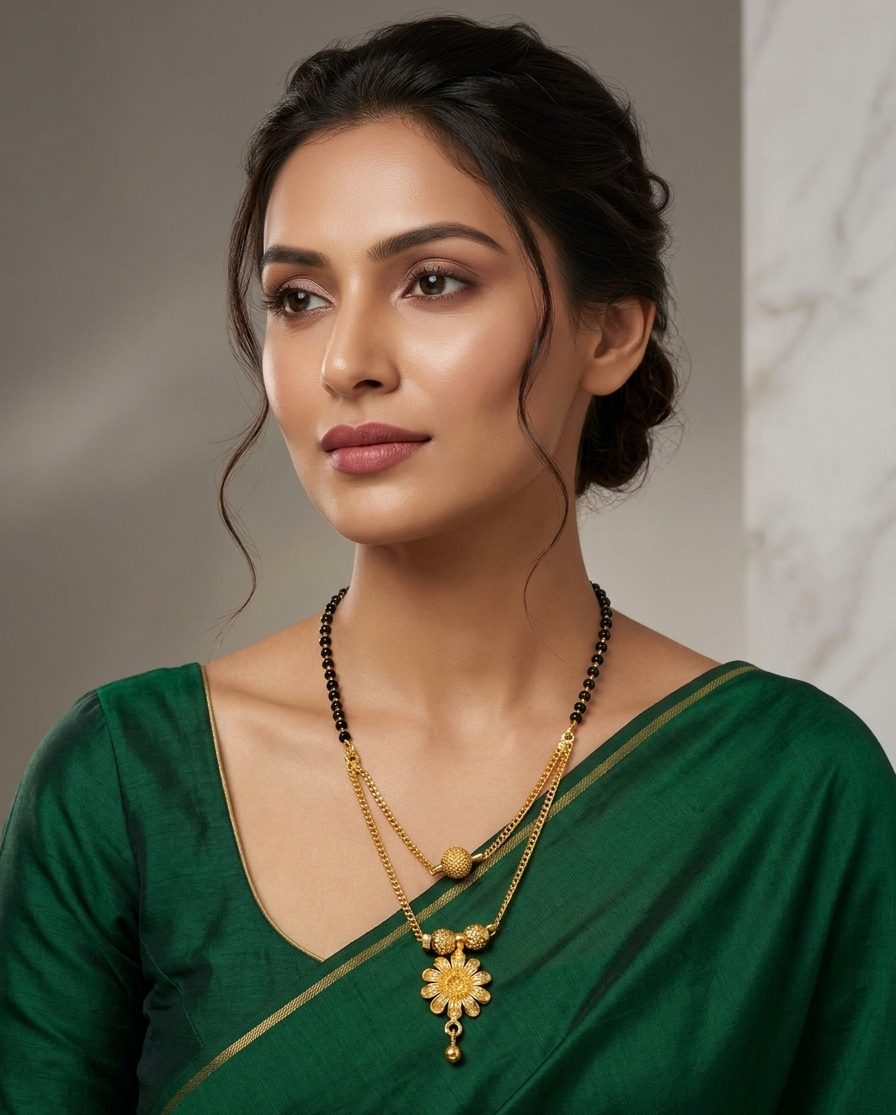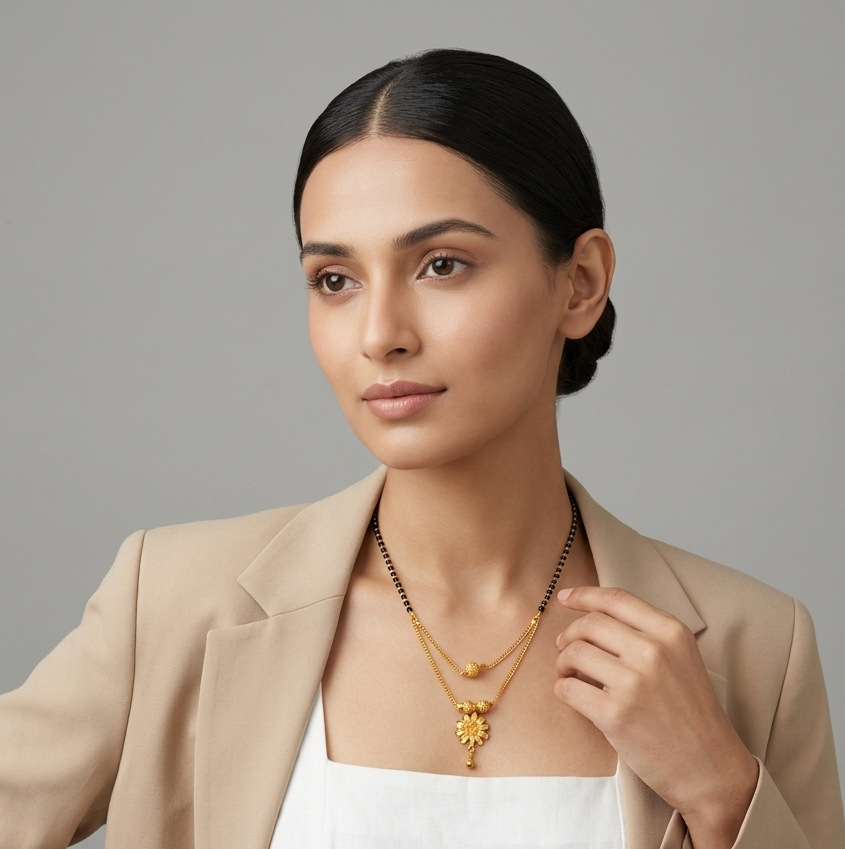 A beautifully crafted double-layer mangalsutra featuring a floral gold-plated pendant and delicate chain detailing. This elegant design blends traditional symbolism with modern styling, making it perfect for everyday wear and special occasions.