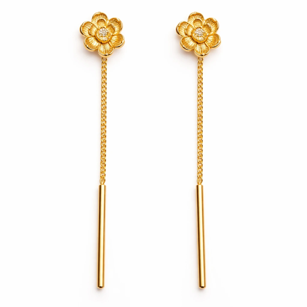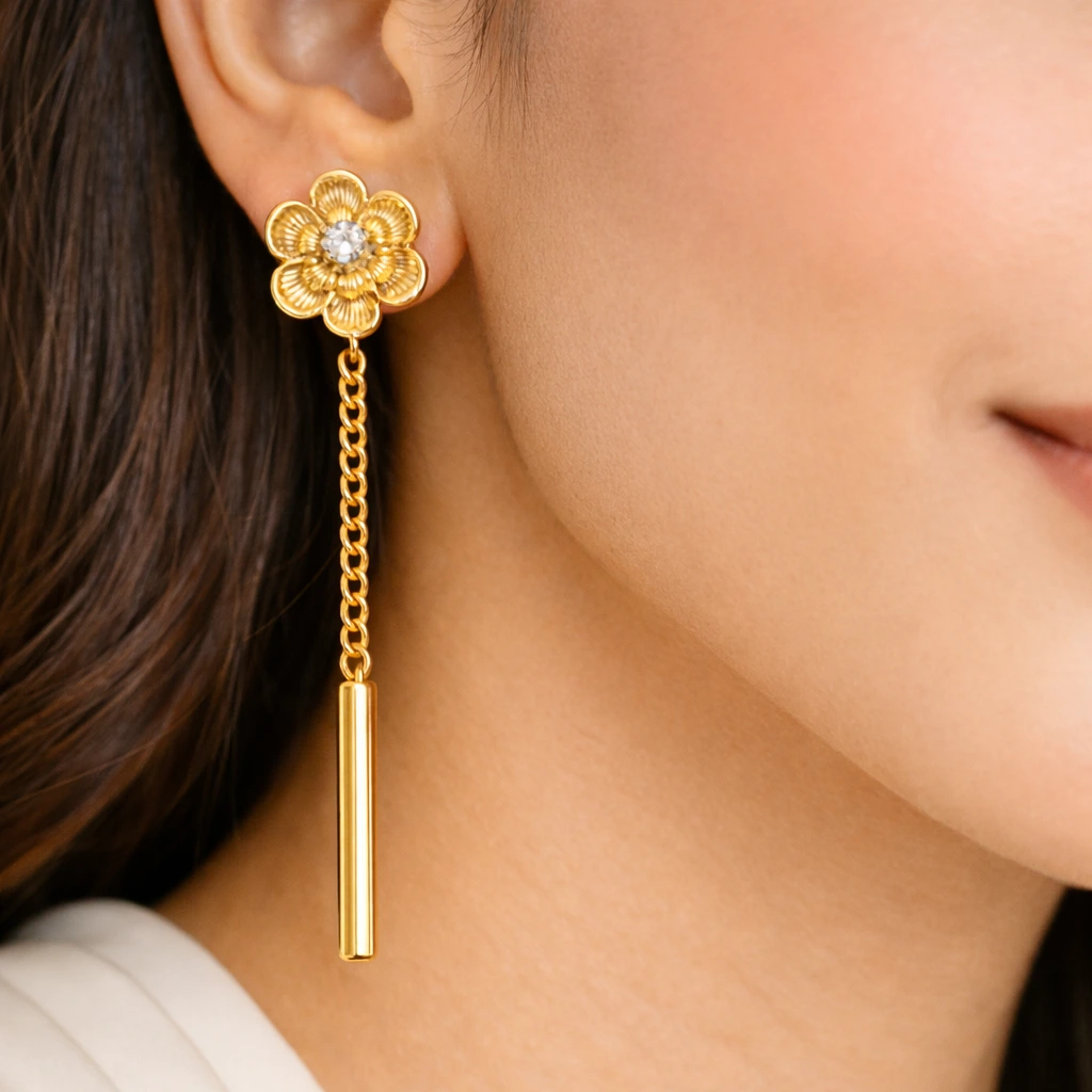 The design features a beautiful floral top motif with a shimmering stone centerpiece, connected to a sleek long chain and polished bar pendant, creating a graceful flowing silhouette. Inspired by the trending Sui Dhaga threader earring style, this pair is lightweight, stylish, and perfect for both ethnic and western outfits.