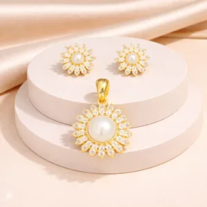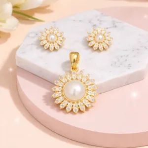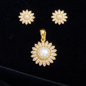 Enhance your style with this luxurious floral pearl pendant and earring set, designed to bring grace and sophistication to every look. The set includes a sunflower-inspired pendant with a lustrous pearl center surrounded by shimmering crystal petals, paired with matching floral stud earrings.