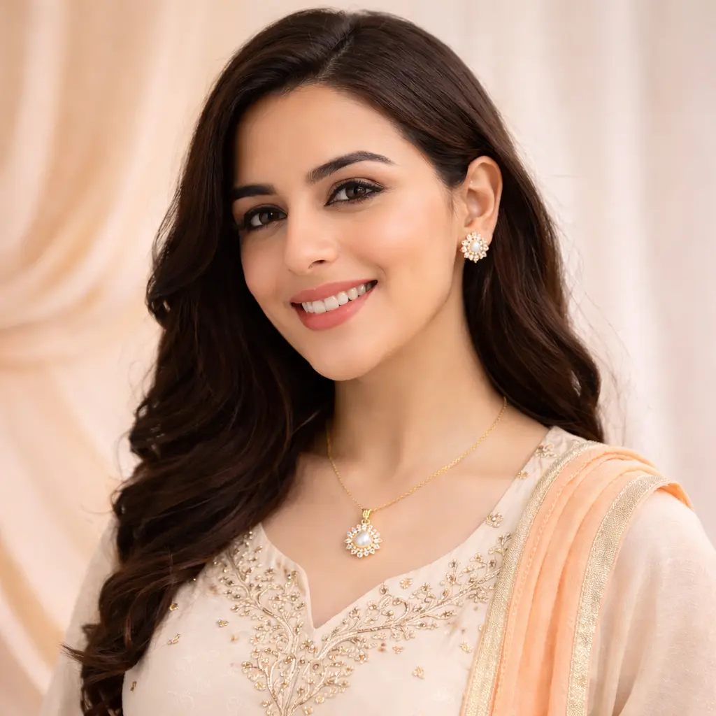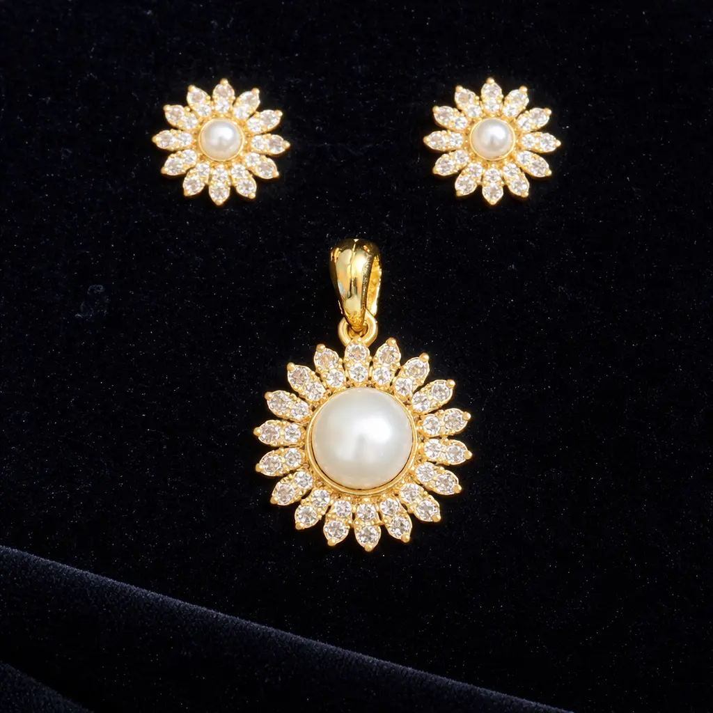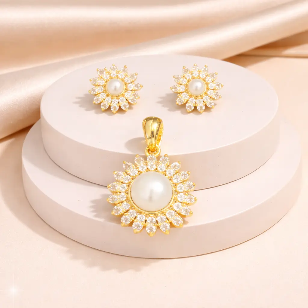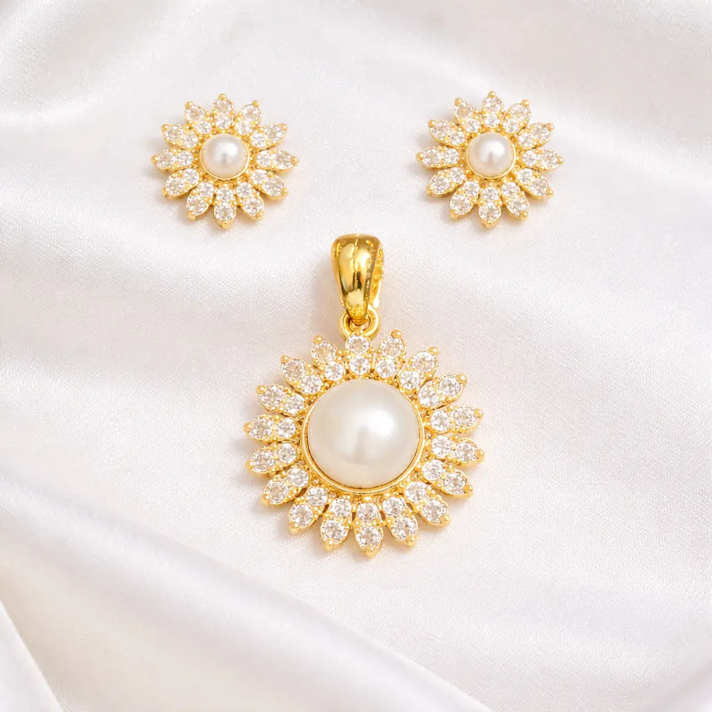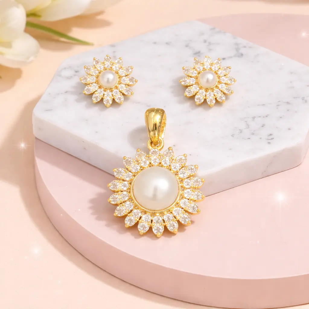 Floral Pearl Pendant Set with Matching Stud Earrings | Gold-Plated CZ Jewelry Set for Women