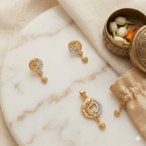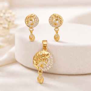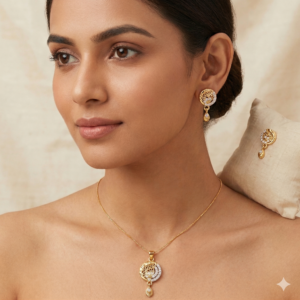 Add effortless elegance to your jewellery collection with this beautifully crafted gold-tone pendant set with matching earrings from Bhabyam. Designed for women who love versatile and stylish jewellery, this set features a finely detailed round pendant paired with perfectly matching stud-drop earrings.