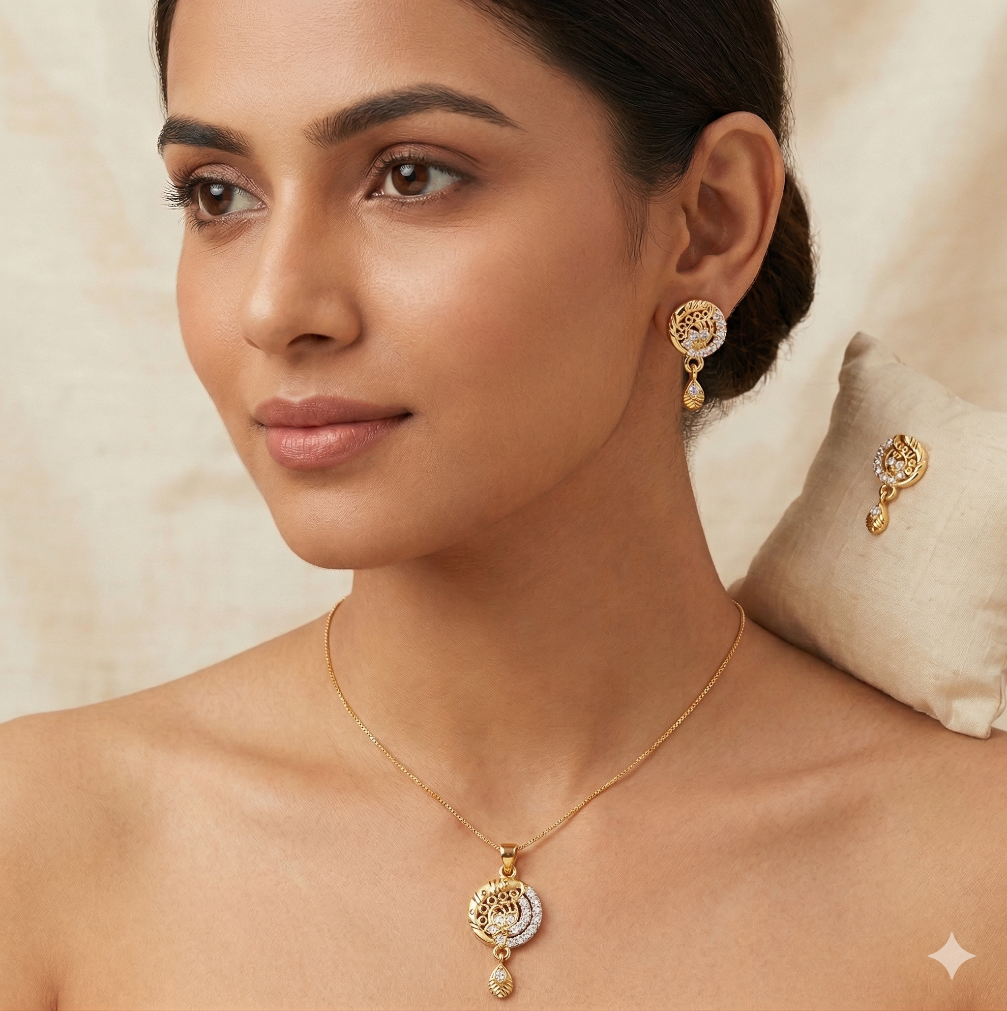 The design combines modern elegance with traditional charm, enhanced by subtle crystal detailing and graceful dangling accents that add movement and shine. The coordinated set creates a complete and polished look, making it easy to style for multiple occasions.