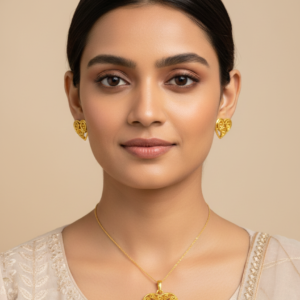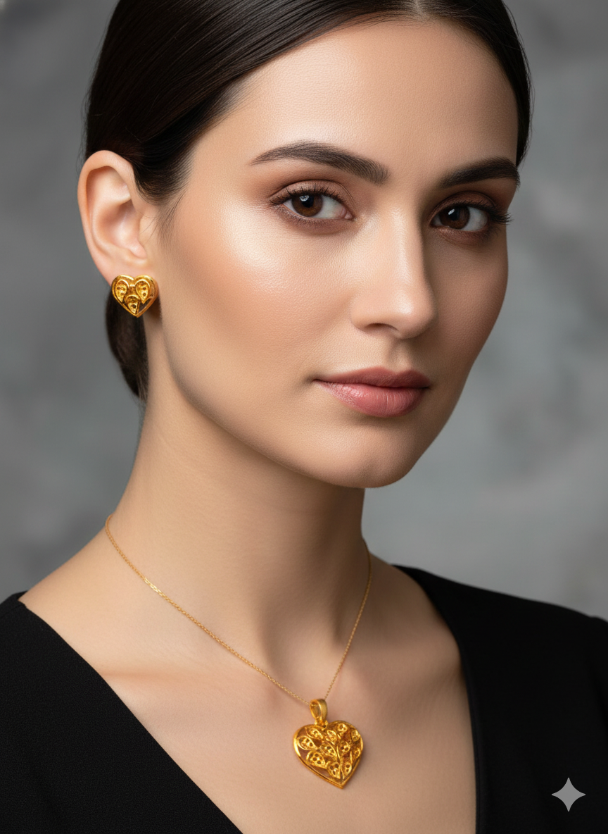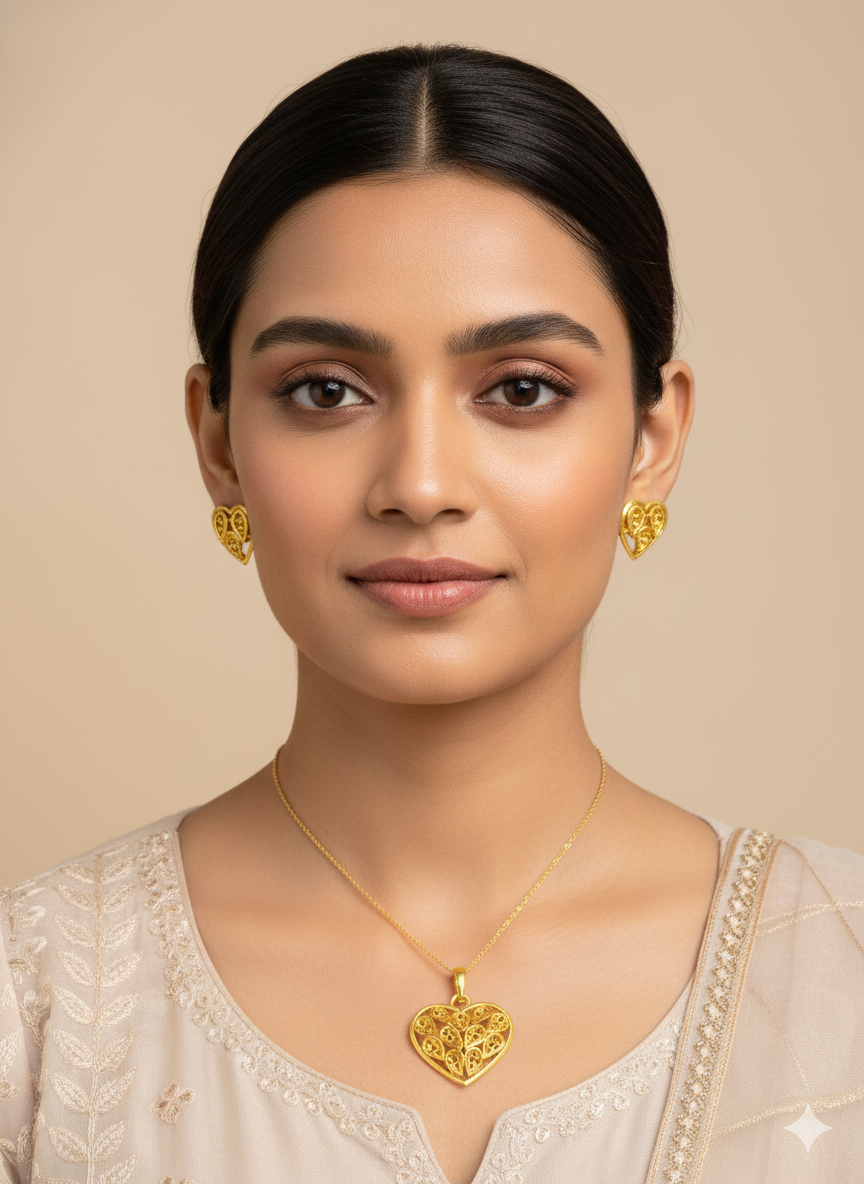 Add a touch of timeless elegance to your look with this heart-shaped earring and pendant set. Hand Crafted with premium 18K gold plating, this skin-friendly jewellery is perfect for everyday wear, Indian outfits, and festive occasions.