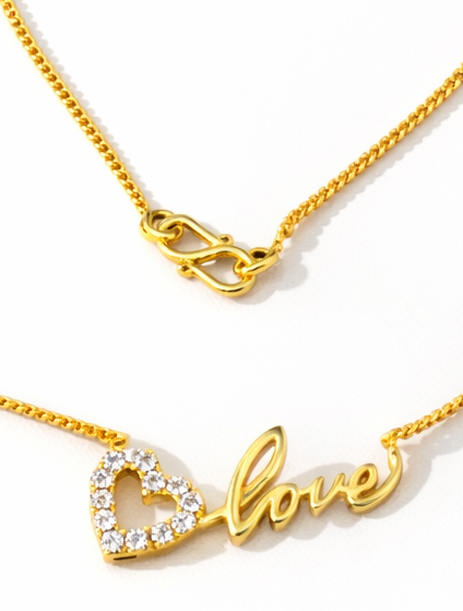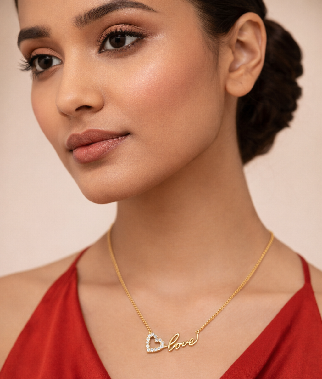 Elegant gold-plated “Love” necklace featuring a crystal-studded heart charm. Lightweight, skin-friendly, and perfect for daily wear, parties, and romantic gifting.