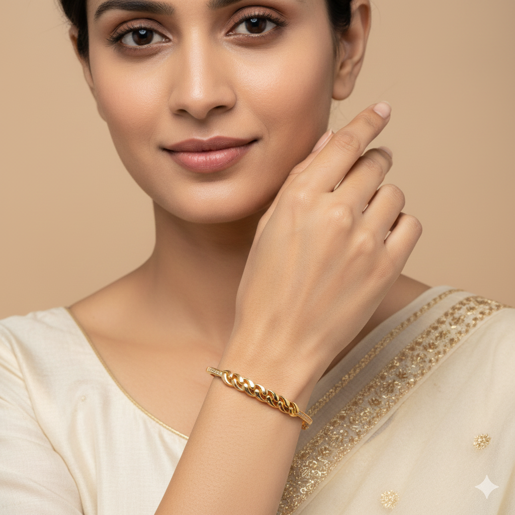 Crafted with high-quality 18K gold plating, this bracelet delivers a rich, long-lasting shine without compromising on comfort. The skin-friendly and lightweight construction makes it ideal for all-day wear, whether you’re heading to work, a festive celebration, or a casual outing.
