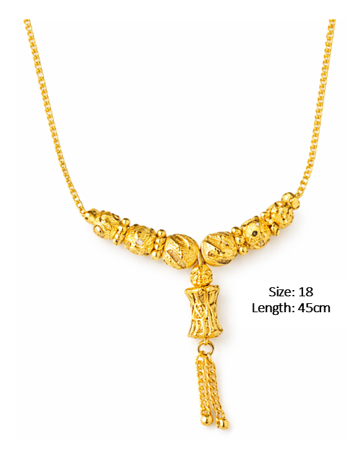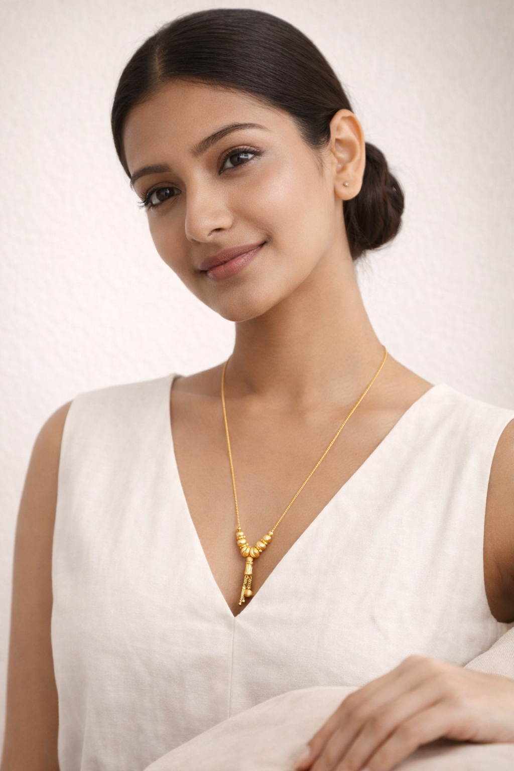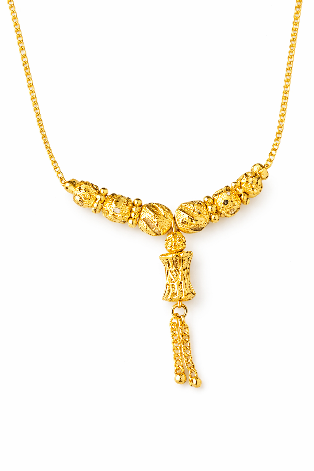 A graceful gold-plated necklace featuring decorative textured beads and a delicate tassel pendant—perfect for daily wear and festive styling.