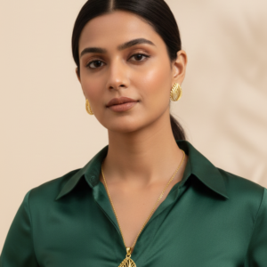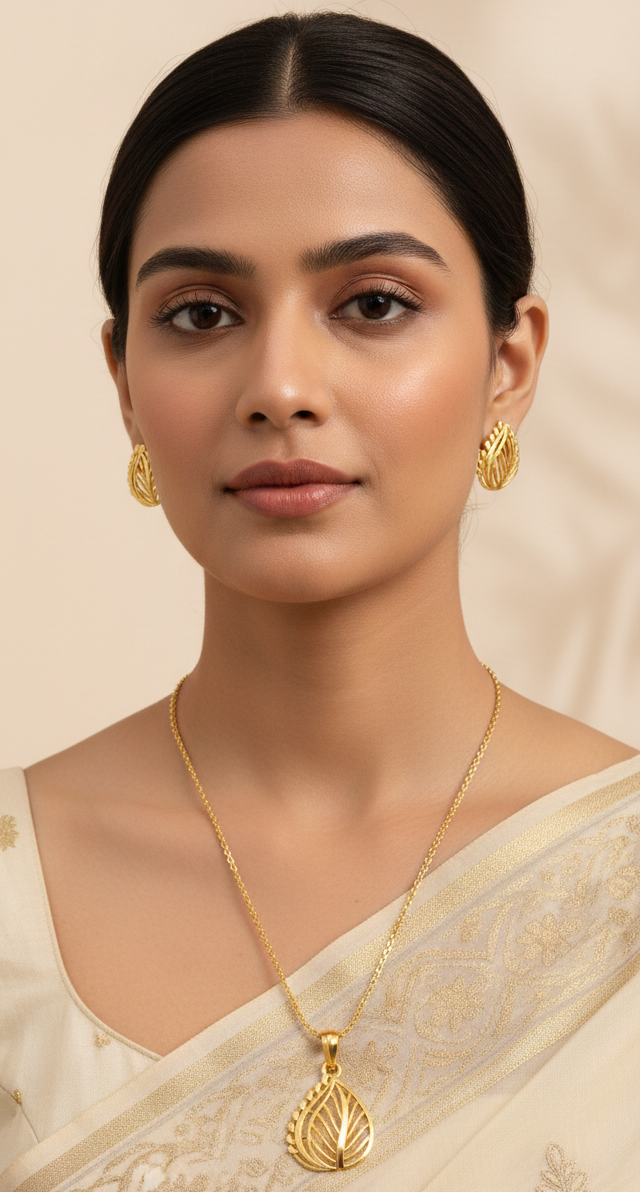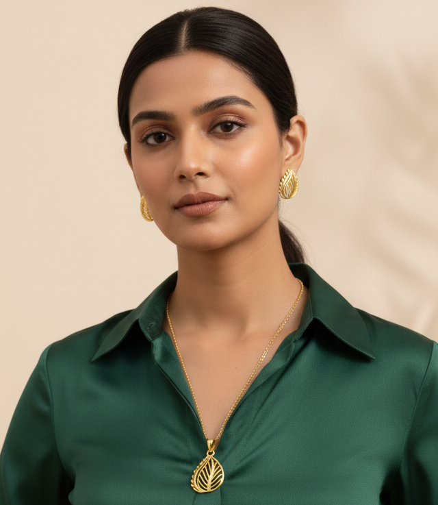 The matching leaf-shaped stud earrings perfectly complement the pendant, creating a coordinated and refined appearance. Whether worn daily or saved for special occasions, this elegant jewellery set is ideal for workwear, parties, festivals, and gifting on birthdays, anniversaries, Diwali, or Valentine’s Day.
