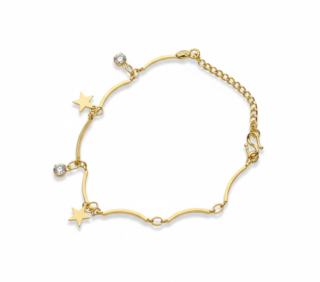 A stylish gold-plated bracelet featuring star charms and sparkling cubic zirconia accents, designed for everyday elegance and modern fashion lovers.