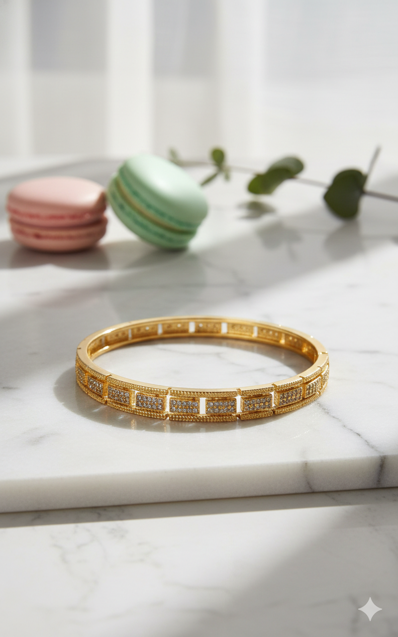 Elevate your jewellery collection with this exquisitely crafted gold-plated CZ-studded designer kada bracelet for women. Designed with a series of finely detailed rectangular segments encrusted with high-quality cubic zirconia stones, this bangle delivers a rich, luxurious look inspired by fine gold jewellery.