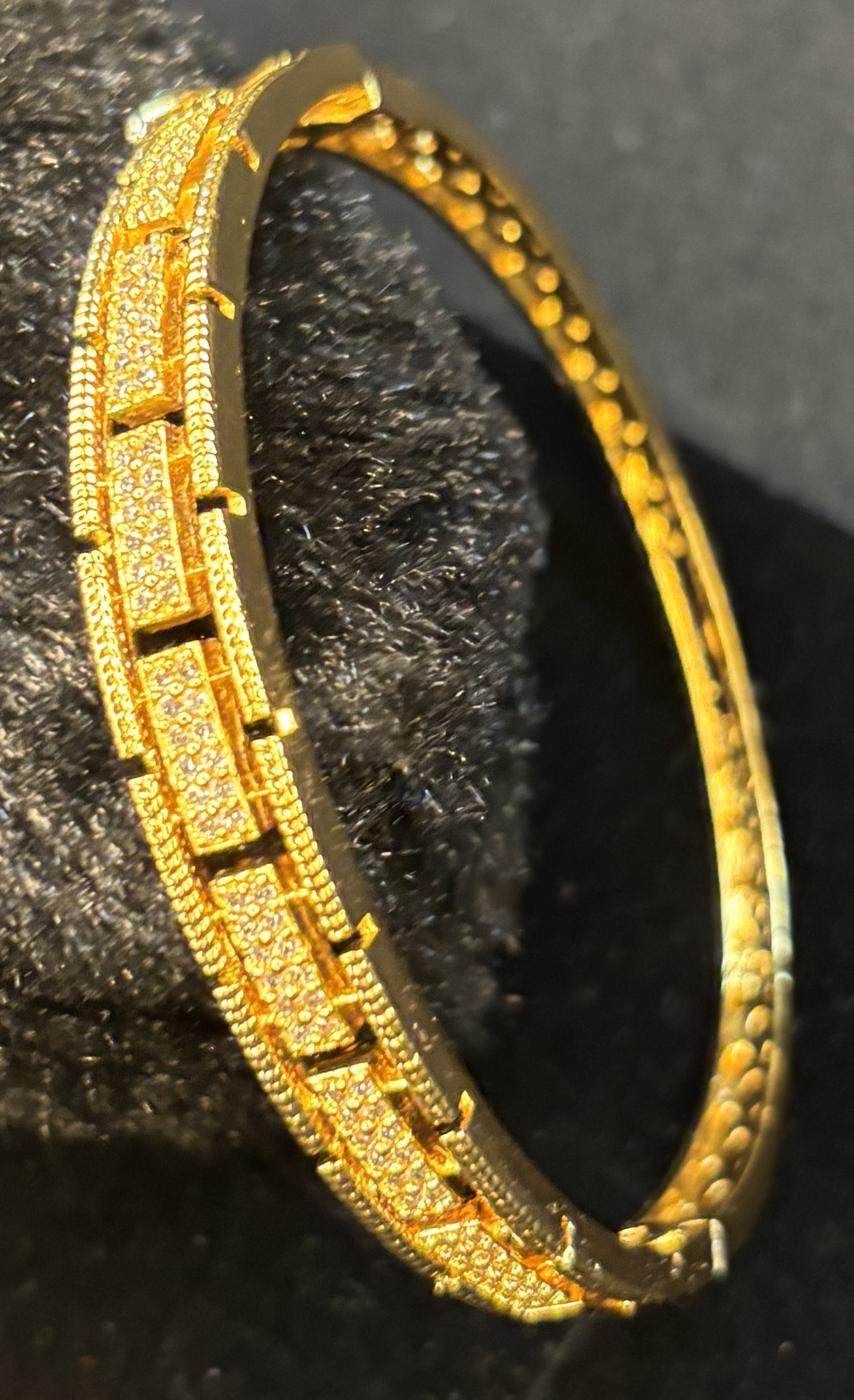 A premium gold-plated designer kada bracelet featuring sparkling cubic zirconia-studded rectangular patterns, perfect for parties, weddings, and festive occasions.