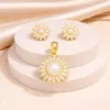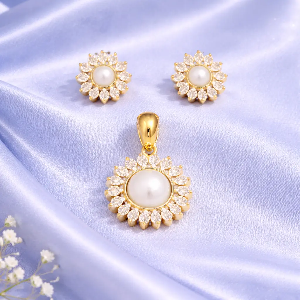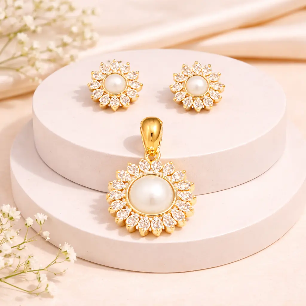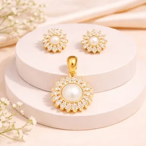 Bring effortless elegance to your jewelry collection with this premium floral pearl pendant and stud earring set, designed for women who love modern sophistication. Inspired by a sunflower floral pattern, the pendant features a lustrous pearl center surrounded by shimmering American diamond-style stones, paired beautifully with matching floral studs.