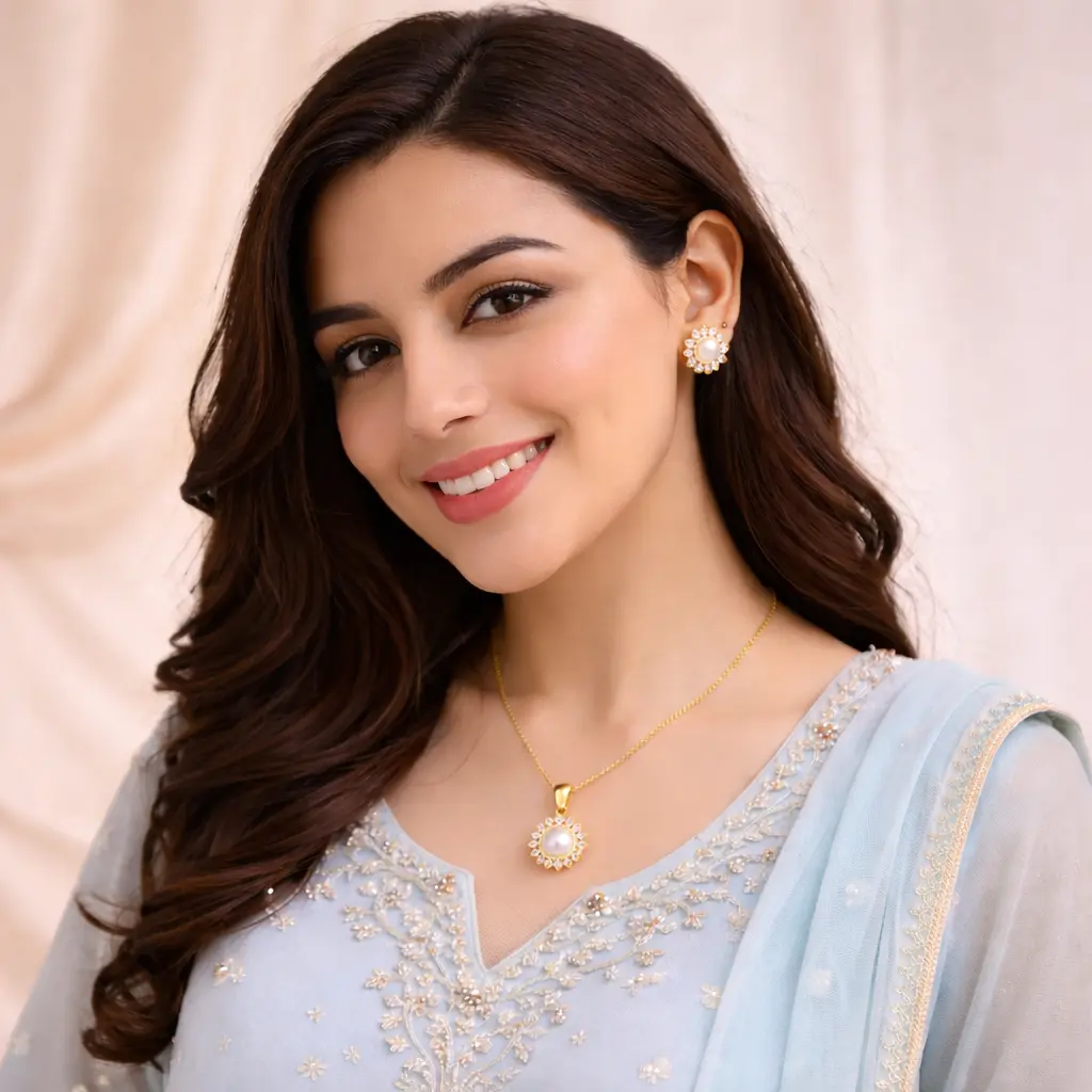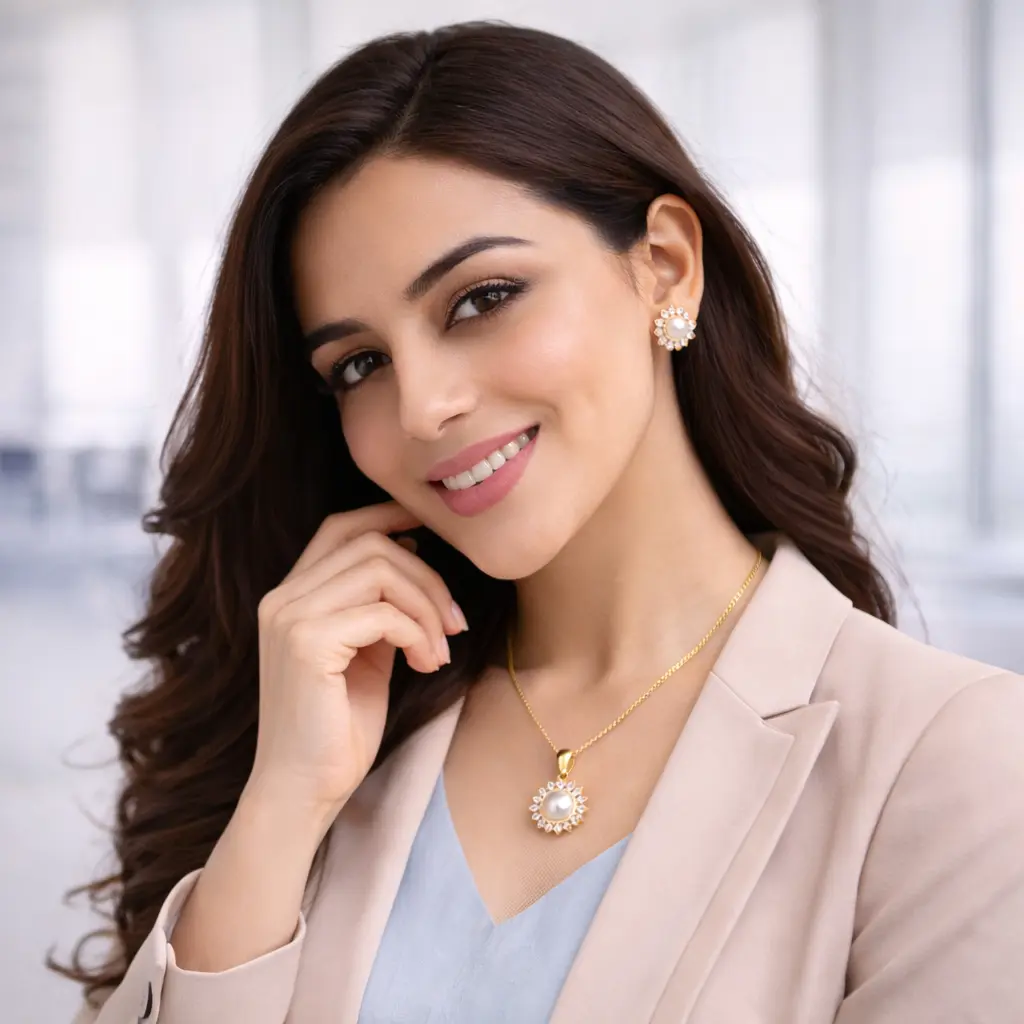 Upgrade your everyday elegance with this beautiful floral pearl pendant set, styled with a modern office wear look. Featuring a radiant pearl centerpiece, sparkling floral stone design, and matching stud earrings, this lightweight jewelry set is perfect for office wear, daily styling, parties, and gifting.