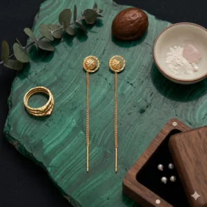The delicate long gold chain paired with a sleek vertical bar creates the signature Sui Dhaga threader style, making these earrings perfect for women who love minimalist luxury jewellery.